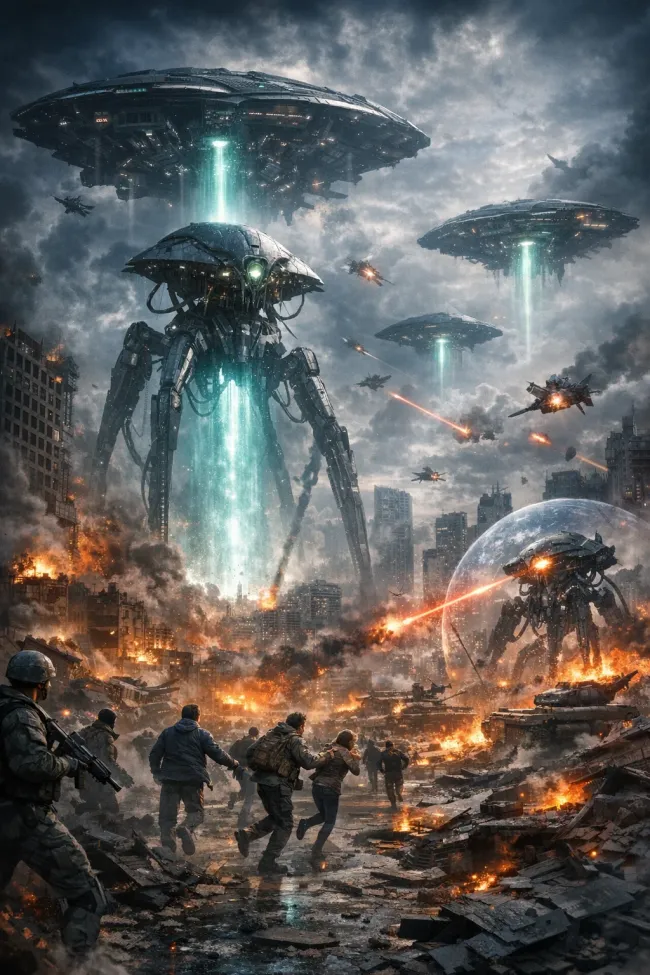 평범한 현대 문명을 쌓으며 평범한 삶 속에서 들이닥친 외계문명, 그들은 지구를 지켜보고 있었으며 땅 속에서 거대 로봇을 텔레포트시킬 정도의 고도의 문명이었다. 삽시간에 인류는 정체불명의 외계세력의 침략을 받았으며 전략적이고도 계획적인 침략이 진행됐다. 인류는 속수무책으로 당하며 반격을 가하지만 보호막을 갖춘 그들의 무기엔 역부족이었다. - 우주전쟁 중에서